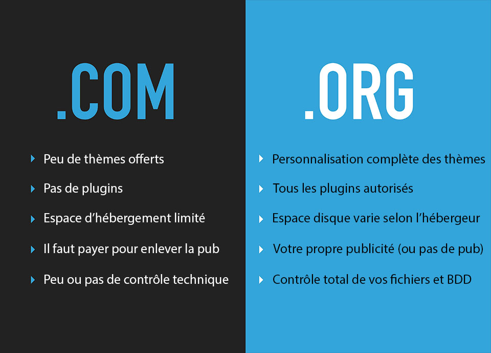 WordPress.com. Il convient de rappeler que WordPress est un logiciel de blogging gratuit. Il peut donc être téléchargé par tout le monde. Avec WordPress.org, vous avez la possibilité d’installer non seulement des thèmes et des plugins, mais aussi y ajouter vos propres publicités pour générer vos revenus. Vous pouvez également modifier le code PHP ainsi que la base de données qui alimente votre site. Bien que WordPress puisse être téléchargé gratuitement, il doit cependant être installé sur un serveur web (généralement payant) pour pouvoir fonctionner.